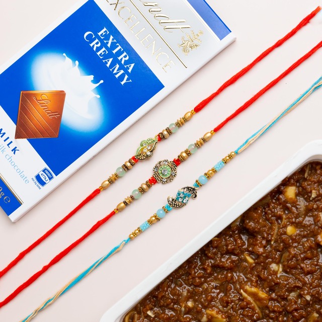 Three Rajwadi Rakhis With Chocolate & Sweet - For New Zealand